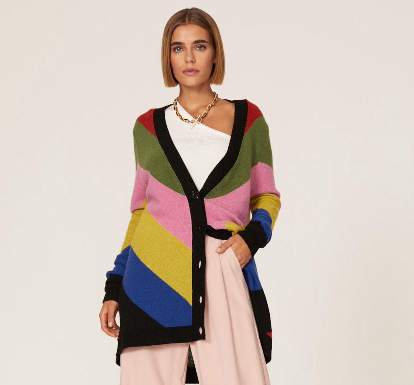 Sara Battaglia’s aesthetic can be described as glamorous and tailored with a feminine twist. With bright pants suits and a healthy dose of rainbow detail, her designs speak volumes.